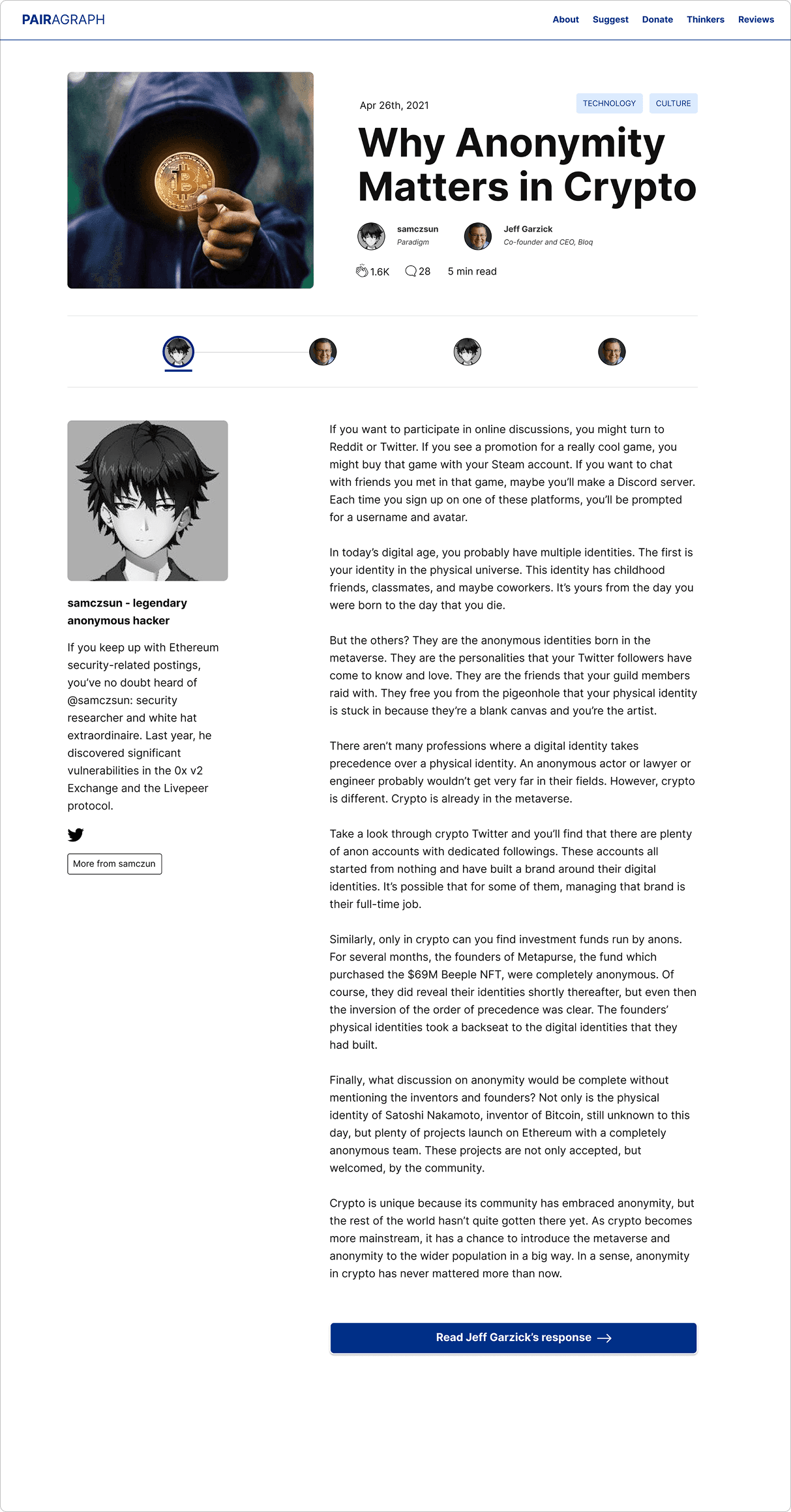 Pairagraph hosts expert debates on complex topics, but the interface wasn't serving the content. Dense text with minimal structure made debates difficult to scan, whilst early-web aesthetics undermined the platform's credibility. The experience was purely passive—no progress tracking, weak author presence, nothing to encourage readers to return as debates evolved. As an active user, I noticed these friction points repeatedly. Platforms like Medium and Substack had set new expectations for online discourse: clear author profiles, visual polish, and engagement features. Pairagraph lacked these contemporary patterns, risking irrelevance despite hosting genuinely valuable conversations between prominent thinkers.